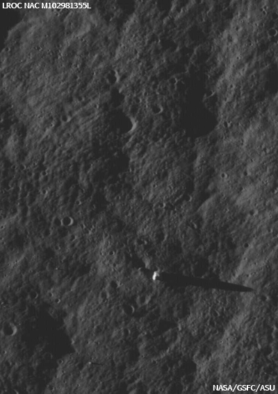 ![A closer look, under a higher sun, allows a detailed view of the bright ejecta of the crater of interest. Full 3 km-width field of view from LROC NAC M138504456L, orbit 5545, September 7, 2010; 29.65° angle of incidence, resolution 66 cm from 63.83 km [NASA/GSFC/Arizona State University].](http://farm8.staticflickr.com/7400/9096556228_d46d39d9a4_c.jpg)