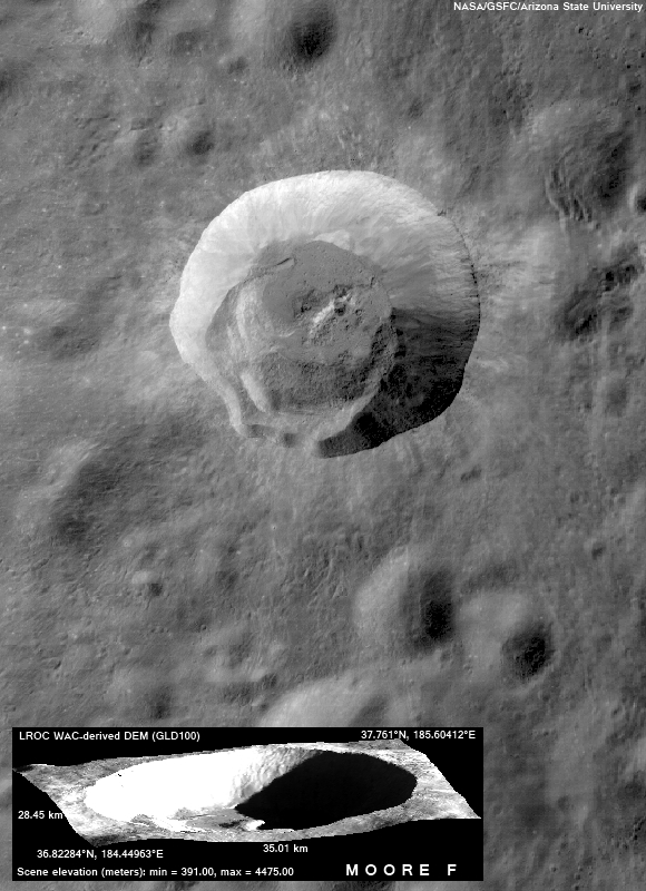 | Closer is not necessarily more informative when sorting though the hundreds of LROC Wide Angle Camera (WAC) observations of Moore F crater. For example, in orbit 10090 (August 30, 2011), the LRO spacecraft resolved Moore F from 40.6 kilometers, and at nearly the same illumination as seen above. That field of view can be seen HERE, and considerable processing will be needed to tease more information than what's readily seen from 15 kilometers higher, above. M158748657CE (604 nm), LRO orbit 8529, April 29, 2011; incidence = 49.73° at 77.235 meters resolution from 55.45 kilometers altitude [NASA/GSFC/Arizona State University]. |