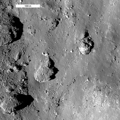 Close-up view of a second block field with prominent banding. Note the layering is also seen in blocks of many sizes, LROC NAC M120161915L [NASA/GSFC/Arizona State University].