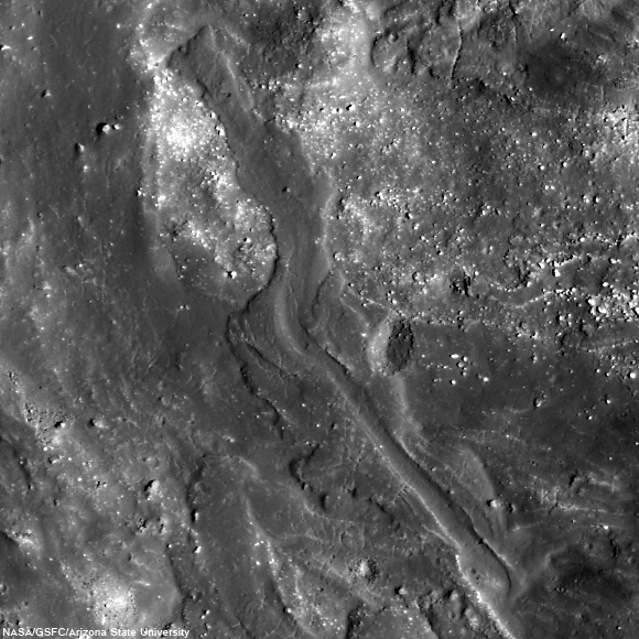 | A portion of the impact melt near the western rim of Mandel'shtam F crater. Image centered near 5.130ºN, 165.822ºE, field of view width is 1182 meters. LROC Narrow Angle Camera (NAC) observation M189515239R , LRO orbit 12981, April 19, 2012; angle of incidence 31.98, full resolution 0.98 meters, from 120.3 km [NASA/GSFC/Arizona State University]. |