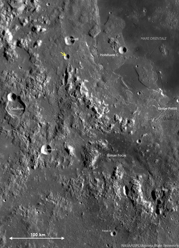 | A wee bit more context (from the spectacularly upgraded LROC WMS Browser) reveals the sparse Fryxell crater group as nested in one of the more dramatic lunar landscapes, and the unnamed "crater of interest" itself (arrow) apparently directly atop one a buried portion of a Mare Orientale peak ring [NASA/GSFC/Arizona State University]. |